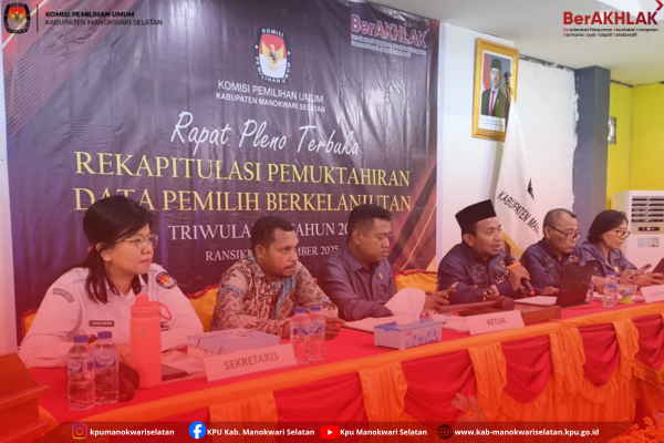 Dalam rangka mewujudkan penyelenggaraan pemilu yang berkualitas, Komisi Pemilihan Umum (KPU) Kabupaten Manokwari Selatan melaksanakan Rapat Pleno Pemutakhiran Daftar Pemilih Berkelanjutan (PDPB) pada Jumat (3/10) bertempat di Aula Kantor KPU Kabupaten Manokwari Selatan di Ransiki. Sebagai bentuk komitmen menjaga akurasi dan validitas data pemilih. Kegiatan ini bertujuan memperbarui data pemilih setiap triwulan, meliputi penambahan pemilih baru, perubahan domisili, status TNI/Polri, hingga pemilih yang meninggal dunia. Rapat pleno dilaksanakan secara terbuka dan partisipatif, melibatkan Bawaslu, Dukcapil, Polres, Dandim, dan instansi terkait guna memastikan transparansi proses. Melalui kegiatan ini, KPU Kabupaten Manokwari Selatan berupaya menjaga hak pilih masyarakat serta mendukung terselenggaranya pemilu yang berkualitas, akuntabel, dan demokratis. Kegiatan ini juga menjadi sarana evaluasi rutin terhadap hasil pemutakhiran data yang dilakukan di tingkat kabupaten, Ketua KPU Provinsi Papua Barat, Francis Edward Makabory, dalam sambutannya menyampaikan bahwa stakeholder terkait juga menjadi aktor penunjang dalam pemilu itu sendiri sehingga diharapkan untuk bisa partisipasi aktif. Dalam rapat pleno ini, disampaikan hasil rekapitulasi data pemilih berdasarkan pleno dari Triwulan sebelumnya dan juga hasil dari Coklit Terbatas (Coktas) yang telah dilaksanakan KPU Kabupaten Manokwari Selatan pada tanggal 22-24 September Tahun 2025. Berdasarkan data tersebut hasil Rapat Pleno Pemuktahiran Data Pemilih Berkelanjutan Triwulan III berjumlah 27.337. Rapat Pleno Pemutakhiran Daftar Pemilih Berkelanjutan merupakan bagian penting dari upaya KPU Kabupaten Manokwari Selatan menjaga keakuratan, validitas, dan transparansi data pemilih. Melalui mekanisme yang sistematis dan kolaboratif, kegiatan ini menjadi wujud nyata komitmen KPU Kabupaten Manokwari Selatan dalam menciptakan pemilu yang jujur, adil, dan berintegritas. ....