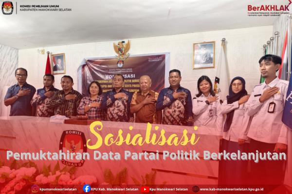 Komisi Pemilihan Umum Kabupaten Manokwari Selatan melaksanakan Sosialisasi Pemutakhiran Data Partai Politik Berkelanjutan sebagai upaya menjaga keakuratan dan validitas data kepartaian. Kegiatan ini bertujuan memberikan pemahaman kepada partai politik terkait pentingnya pembaruan data secara berkelanjutan sesuai ketentuan yang berlaku. Dalam sosialisasi tersebut, KPU Kabupaten Manokwari Selatan menyampaikan mekanisme dan tahapan pemutakhiran data, termasuk kewajiban partai politik untuk memperbarui data kepengurusan, keanggotaan, serta administrasi lainnya melalui sistem yang telah disediakan. Melalui kegiatan ini, diharapkan partai politik di Kabupaten Manokwari Selatan dapat lebih proaktif dan tertib administrasi, sehingga mendukung kelancaran tahapan pemilu serta memperkuat kualitas demokrasi yang transparan dan akuntabel. ....