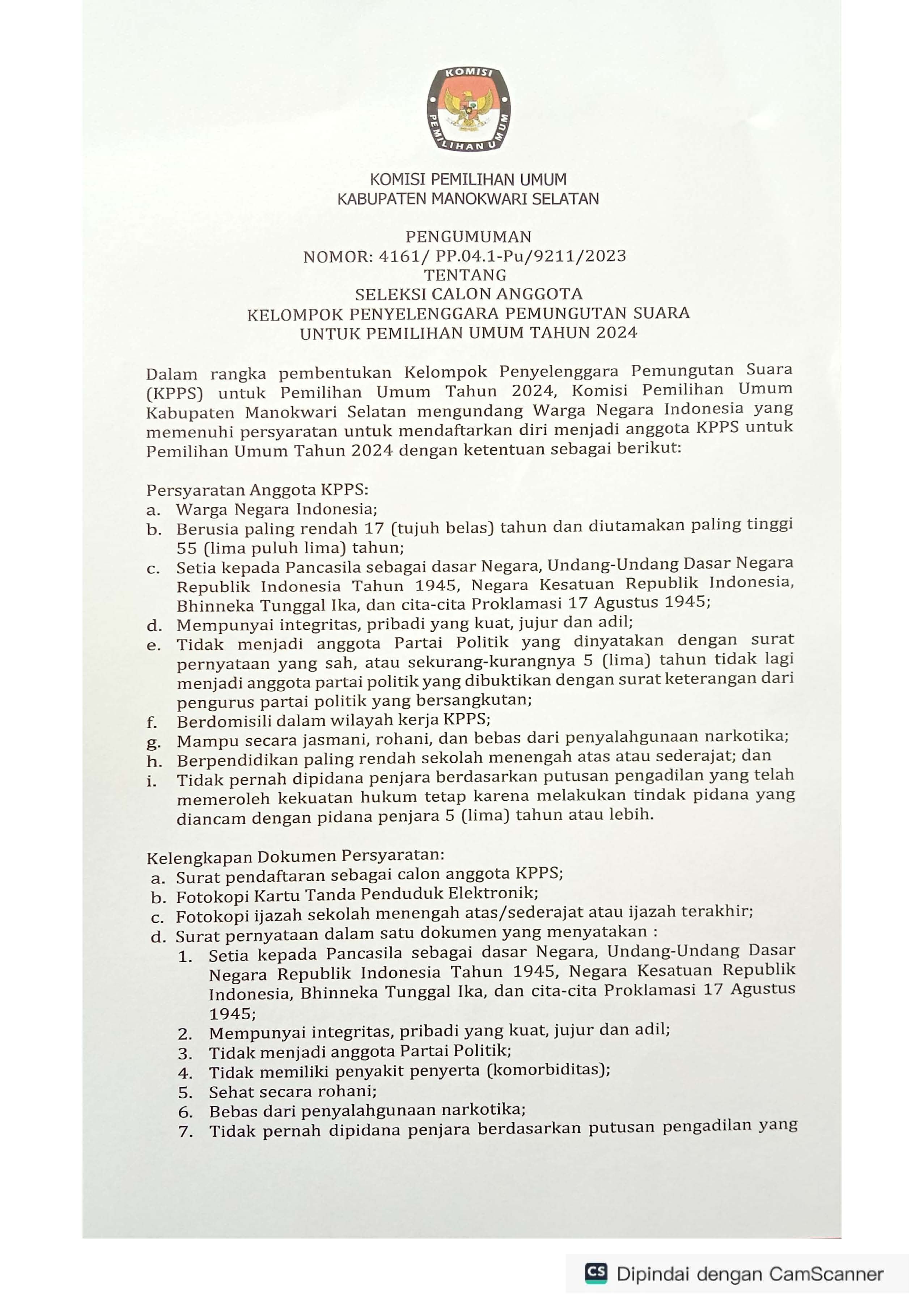 PENGUMUMAN SELEKSI CALON ANGGOTA KPPS UNTUK PEMILIHAN UMUM TAHUN 2024 Senin, 11 Desember 2023 08:44 454 DOWNLOAD PENGUMUMAN Baca Selengkapnya