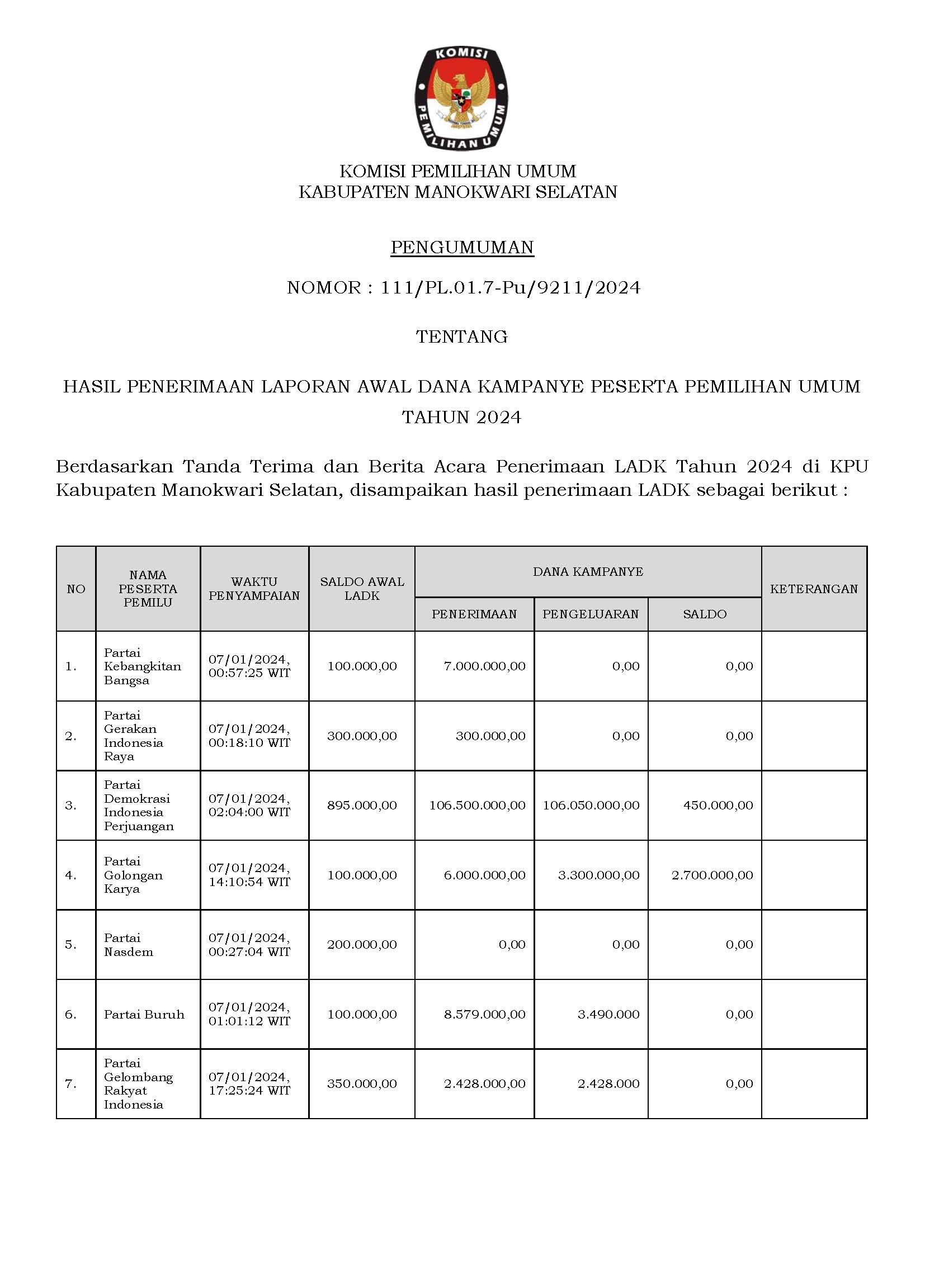 PENGUMUMAN PENETAPAN HASIL PEMILIHAN UMUM ANGGOTA DPRD KABUPATEN MANOKWARI SELATAN TAHUN 2024 Rabu, 06 Maret 2024 07:00 763 DOWNLOAD PENGUMUMAN Baca Selengkapnya