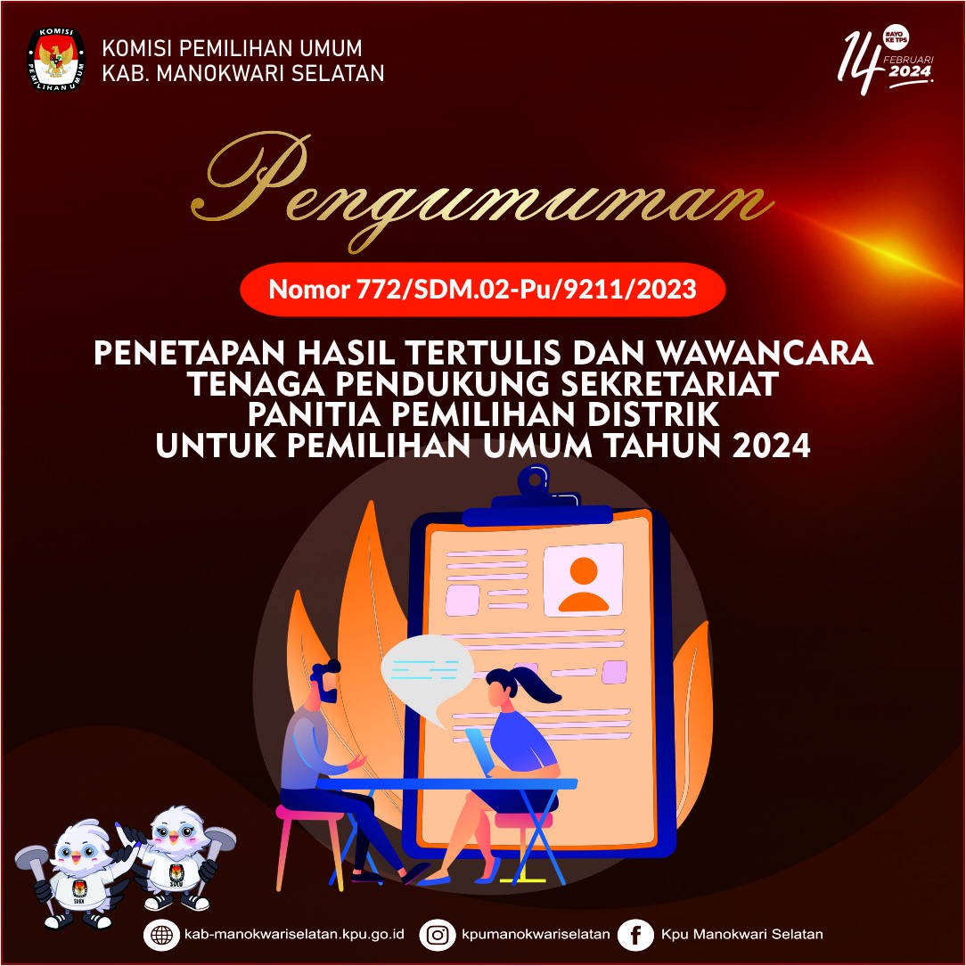 PENGUMUMAN PENETAPAN HASIL TERTULIS DAN WAWANCARA TENAGA PENDUKUNG SEKRETARIAT PANITIA PEMILIHAN DISTRIK (PPD) Senin, 06 Maret 2023 09:00 747 DOWNLOAD PENGUMUMAN Baca Selengkapnya
