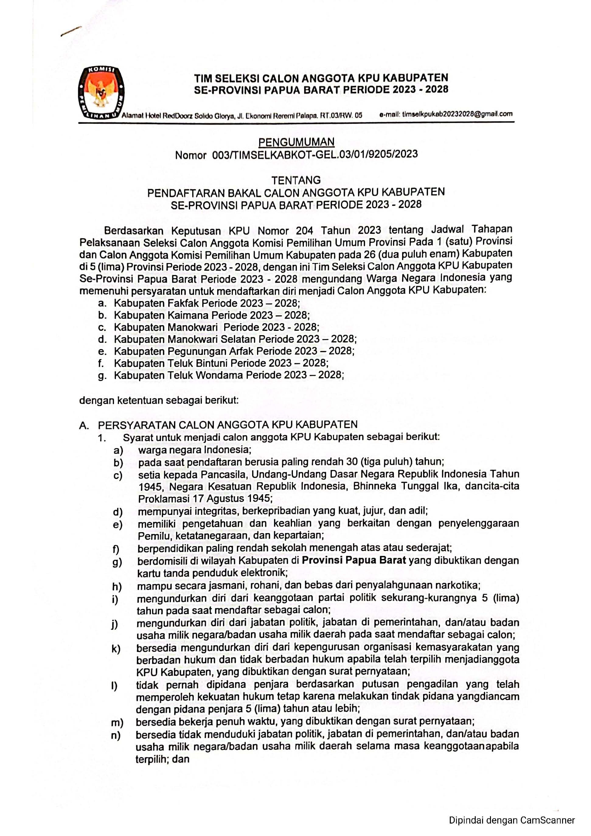 PENGUMUMAN PENDAFTARAN BAKAL CALON ANGGOTA KPU KABUPATEN SE-PROVINSI PAPUA BARAT PERIODE 2023-2028 Rabu, 22 Maret 2023 11:00 1036 DOWNLOAD PENGUMUMAN Baca Selengkapnya