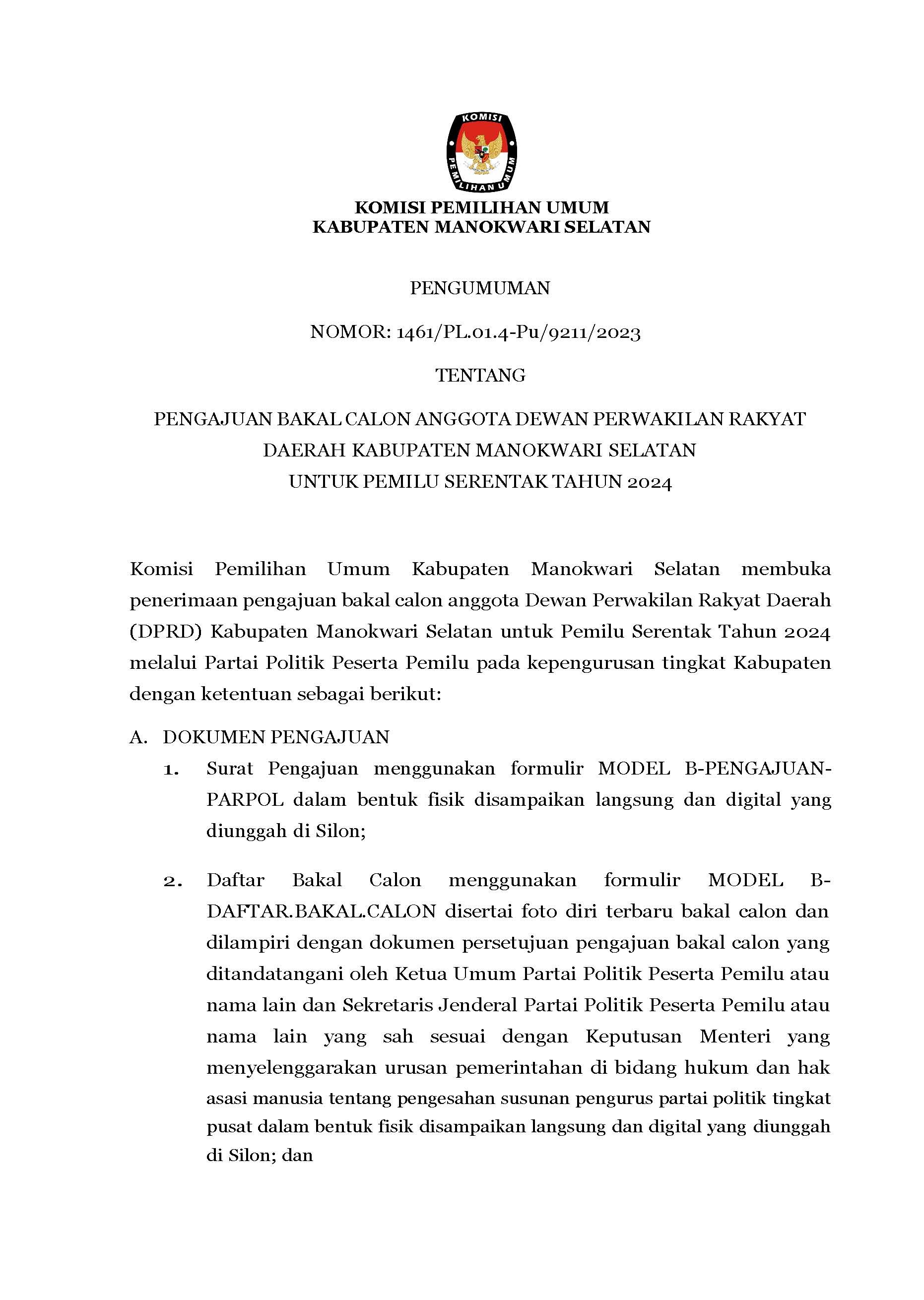 PENGUMUMAN PENGAJUAN BAKAL CALON ANGGOTA DEWAN PERWAKILAN RAKYAT DAERAH KABUPATEN MANOKWARI SELATAN UNTUK PEMILU SERENTAK TAHUN 2024 Senin, 24 April 2023 07:00 1262 DOWNLOAD PENGUMUMAN Baca Selengkapnya